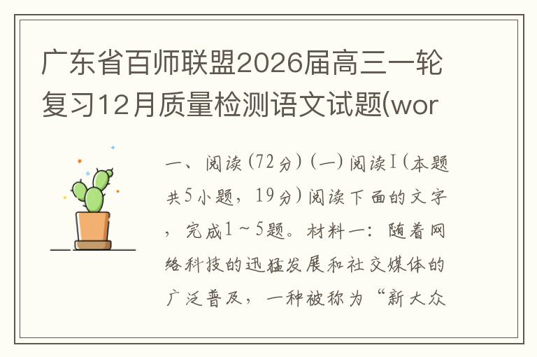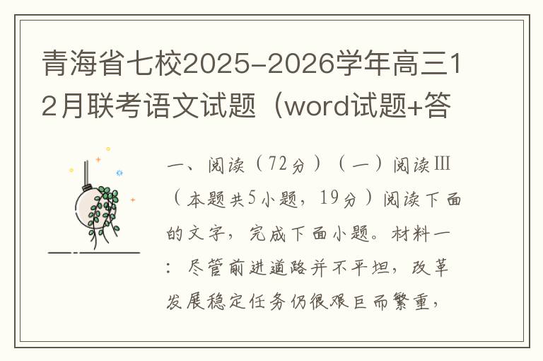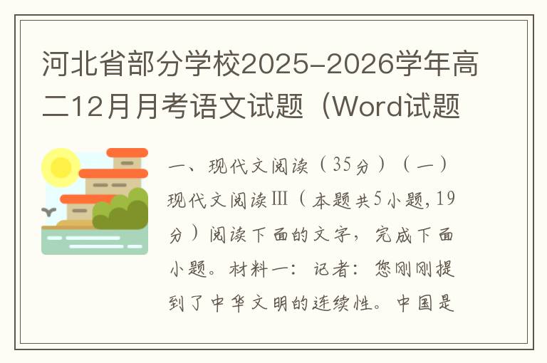 一、现代文阅读(35分) (一)现代文阅读I(本题共5小题,19分)阅读下面的文字,完成1~5题。材料一:我认为《红楼梦》是康、雍、乾三朝的社会生活、社会矛盾、历史趋向的一个艺术的总概