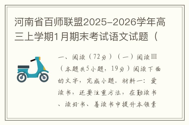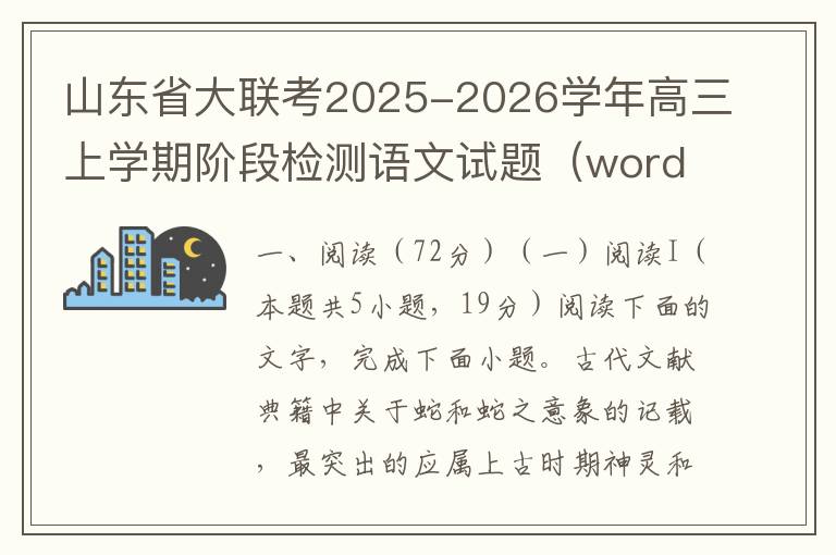 一、现代文阅读(37分)(一)现代文阅读Ⅰ(本题共5小题,19分)材料一:谶言源于古代巫文化,本指古代巫师、方士等以谶术所做的预言。从先秦起,谶言在历史故事中已多有记载。到了明清