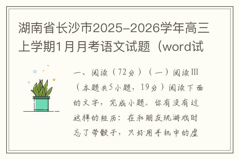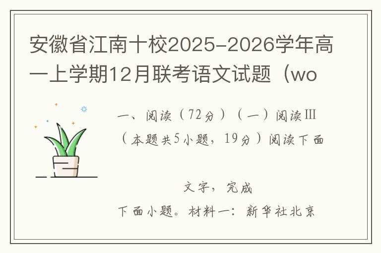 一、阅读(72分)(一)阅读Ⅰ(本题共5小题,19分)阅读下面的文字,完成1~5题。种植入门问答问一:壁如种植一株树,或者一株花,如何能使之必然生活,而且会发荣滋长?答:如果这一株花或树,得来时并无